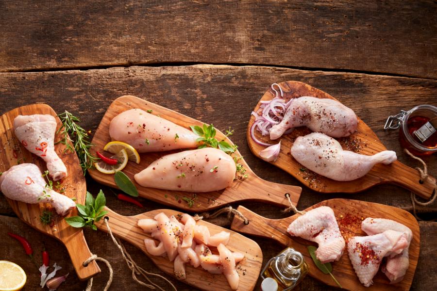 Ears of wheat and bowl of wheat grains on brown wooden background