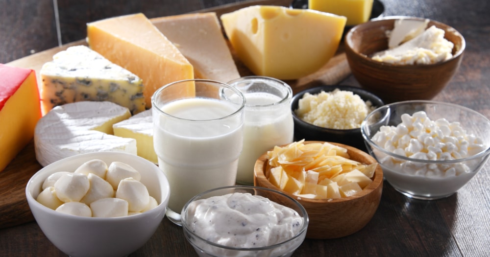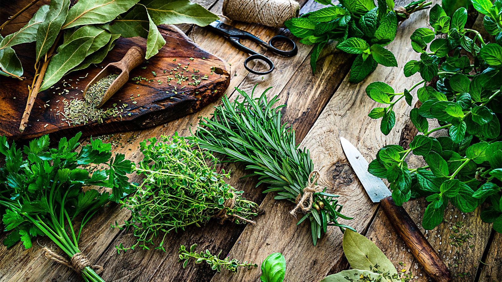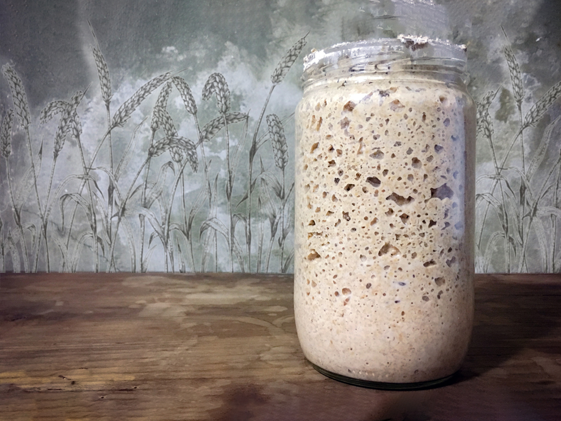 Ears of wheat and bowl of wheat grains on brown wooden background